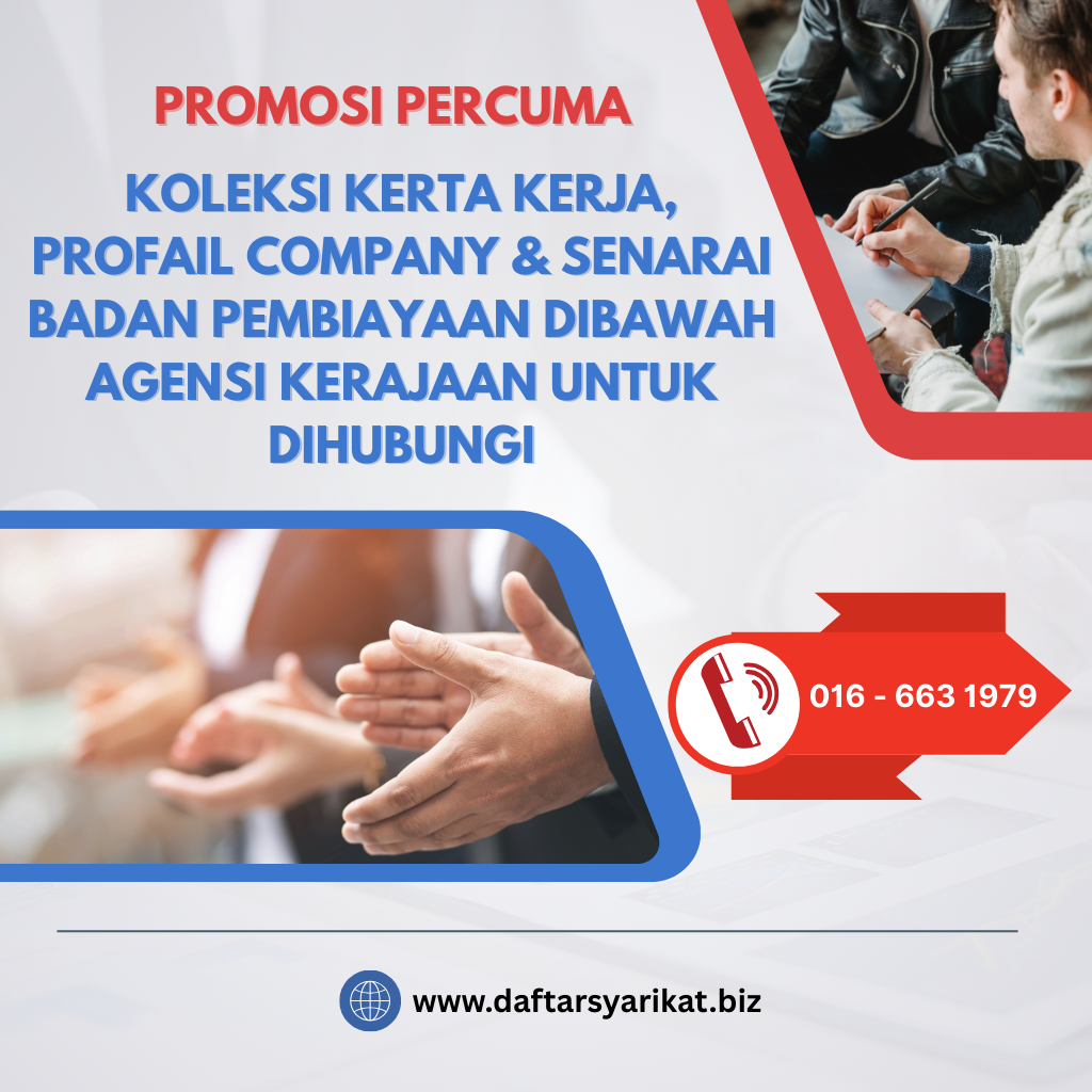 Promosi Percuma Koleksi Kertas Kerja, Template Profail Company Dan Senarai Badan Pembiayaan Dibawah Agensi Kerajaan Untuk Dihubungi. Urusan Daftar / Kemaskini SSM,CIDB & MOF Sekarang!